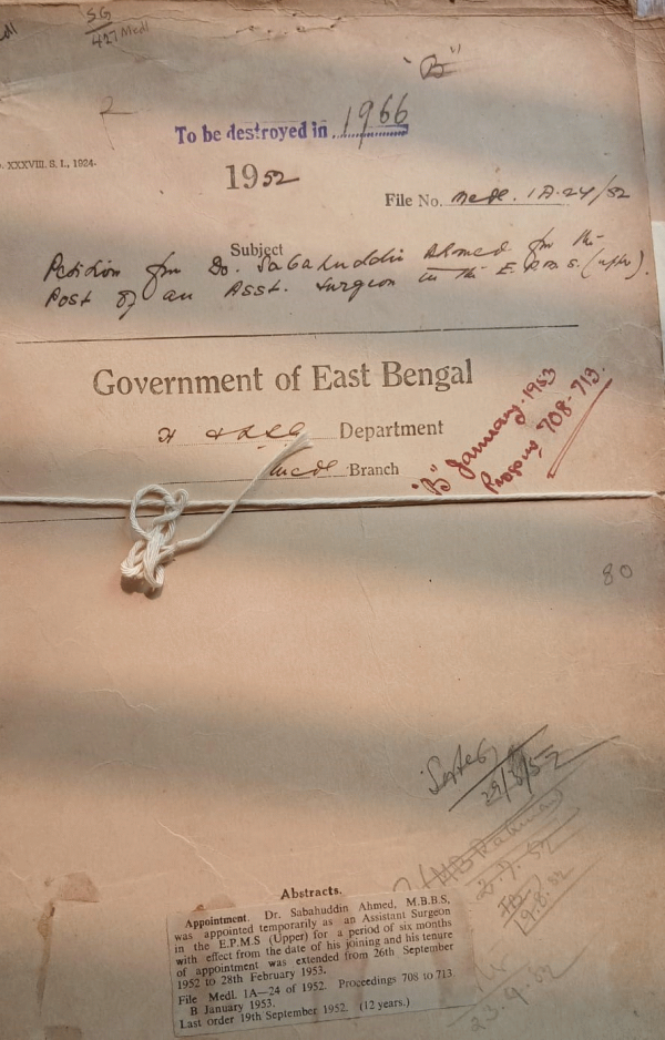 | Rack No. 10, Bundle No. 119 Sl No. 9877 A.Q. by Mrs. Anwara Khatun, M.L.A. regarding common room for the female medical students in D.M.C. | Rack No. 10, Bundle No. 119 Sl No. 9878 Nursing staff etc. Uniformity in scales of pay of | Rack No. 10, Bundle No. 119 Sl No. 9879 Proposal for creation of "Night Guard" for the office of the D.H.O. of the Prov. District". | Rack No. 10, Bundle No. 119 Sl No. 9880 Appointment of Dr. Sabahuddin Ahmed for the Post of an A/S. in the E.P.M.S. (Upper). | Rack No. 10, Bundle No. 119 Sl No. 9881 Sanction of a post of Night Guard cum Darwan for guarding the newly constructed C/S's office, Jessore. | Rack No. 10, Bundle No. 119 Sl No. 9882 Grant for the purchase of doors and almirahs for the newly started library for the patients of D.M.C.H. | Rack No. 10, Bundle No. 119 Sl No. 9883 Supply of lethal weapons for the use in the Medico legal Museum of the D.M.C. |