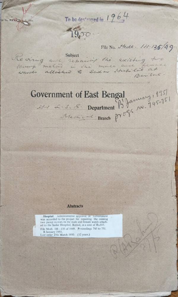 | Rack No. 8, Bundle No. 80 Sl No. 6210 Extension of tenure of appointment of S.K. Sen Honorary visiting Surgeon Dacca Mitford Hospital. | Rack No. 9, Bundle No. 110, Sl No. 9022 Proposal for Establishment of a Hospital and Dispensary at Jakiganj (Assam). | Rack No. 9, Bundle No. 110, Sl No. 9023 Retention of the temporary Posts of Demonstrators in Dacca, Mymensingh Chittagong Medical School. | Rack No. 9, Bundle No. 110, Sl No. 9024 Repairing the existing two Pump Motors in the Male and Female wards attached to Sadar Hospitals at Barisal. | Rack No. 9, Bundle No. 110, Sl No. 9025 Payment of Rs. 180/4/3 being the diet charges of the Staff of the Barisal Hospital. | Rack No. 9, Bundle No. 110, Sl No. 9026 Grant of house rent allowance to the staff of Auxiliary govt. and F.R.E. Hospital. | Rack No. 9, Bundle No. 110, Sl No. 9027 Providing additional dining hall, Kitchen and water tap for the students of the Dacca Medical School. |
