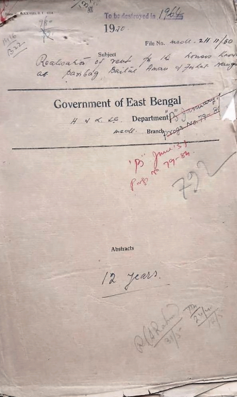 | Rack No. 09, Bundle No. 107, Sl No. 8789 Accommodation of the staff of the central medical stones at Tejgaon. | Rack No. 09, Bundle No. 107, Sl No. 8790 Regarding purchase of still and sanction of one ward servant. | Rack No. 09, Bundle No. 107, Sl No. 8791 Proposal for appoint of an accounted A.G. Hospitals Sheds to the Judicial Department for construction of a witness Shed adjust to Civil Court Permission Mymensingh. | Rack No. 09, Bundle No. 107, Sl No. 8792 Rent due from Miss Ansari for her occupation of the house known as Paribagh. | Rack No. 09, Bundle No. 107, Sl No. 8793 Recording of evidence of govt. officers before transfer. | Rack No. 09, Bundle No. 107, Sl No. 8794 Purchase iron safe for the central medical stores Tajgoen. | Rack No. 09, Bundle No. 107, Sl No. 8795 Govt. Pleased to authorize P.A. (Stores) East Bengal. |