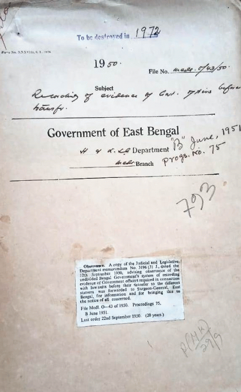 | Rack No. 09, Bundle No. 107, Sl No. 8790 Regarding purchase of still and sanction of one ward servant. | Rack No. 09, Bundle No. 107, Sl No. 8791 Proposal for appoint of an accounted A.G. Hospitals Sheds to the Judicial Department for construction of a witness Shed adjust to Civil Court Permission Mymensingh. | Rack No. 09, Bundle No. 107, Sl No. 8792 Rent due from Miss Ansari for her occupation of the house known as Paribagh. | Rack No. 09, Bundle No. 107, Sl No. 8793 Recording of evidence of govt. officers before transfer. | Rack No. 09, Bundle No. 107, Sl No. 8794 Purchase iron safe for the central medical stores Tajgoen. | Rack No. 09, Bundle No. 107, Sl No. 8795 Govt. Pleased to authorize P.A. (Stores) East Bengal. | Rack No. 09, Bundle No. 107, Sl No. 8796 Payment of advancement change of Rs. 430/8/F for the advertisement in the Dhaka medical College Hospital 1950-51. |