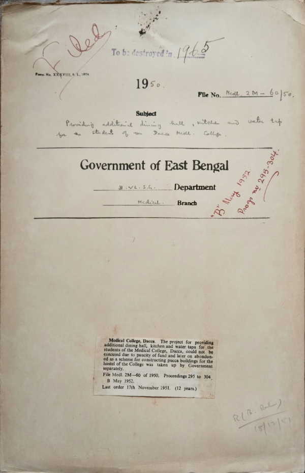 | Rack No. 9, Bundle No. 110, Sl No. 9024 Repairing the existing two Pump Motors in the Male and Female wards attached to Sadar Hospitals at Barisal. | Rack No. 9, Bundle No. 110, Sl No. 9025 Payment of Rs. 180/4/3 being the diet charges of the Staff of the Barisal Hospital. | Rack No. 9, Bundle No. 110, Sl No. 9026 Grant of house rent allowance to the staff of Auxiliary govt. and F.R.E. Hospital. | Rack No. 9, Bundle No. 110, Sl No. 9027 Providing additional dining hall, Kitchen and water tap for the students of the Dacca Medical School. | Rack No. 9, Bundle No. 110, Sl No. 9028 Grant of special pay & conveyance allowance to S.A.S. Dr. Ranizuddin Ahmed M/O. govt. Hostel, Dacca. | Rack No. 9, Bundle No. 110, Sl No. 9029 Repairs to T.B. Segregation Hospital at Jessore, 1950-51. | Rack No. 9, Bundle No. 110, Sl No. 9030 Arrear pay of Mr. Hashibur Rahman award servant of Mitford Hospital, Dacca. |