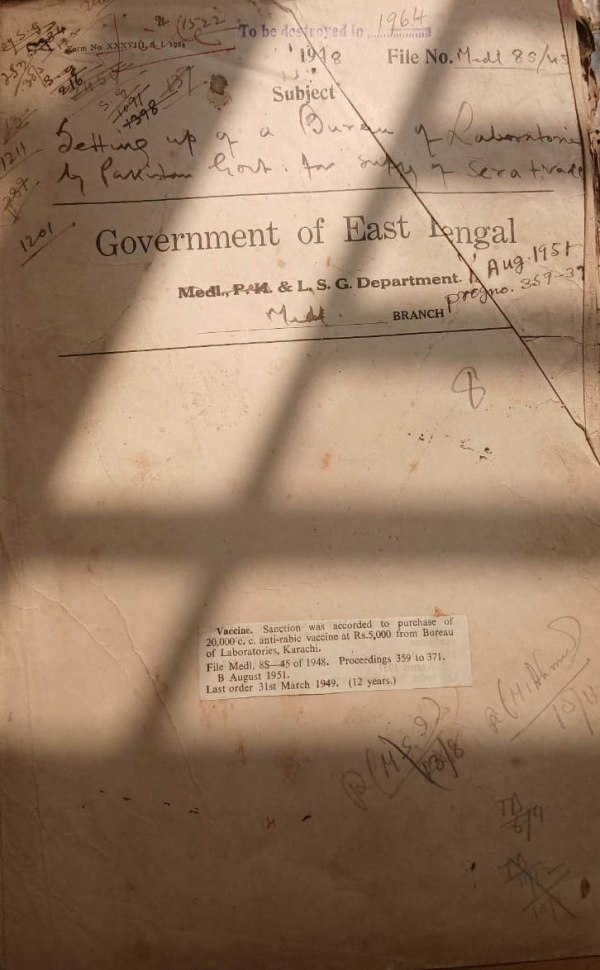 | Rack No. 09, Bundle No. 107, Sl No. 8805 Repatriation of the Mental Patient Manindra Chandra Chakravarty. | Rack No. 09, Bundle No. 107, Sl No. 8806 Cutting from "Ittehed" (Mafasil edition) dated 2nd Ashar 1355 B.S. regarding Bansdah Charitable Dispensary. | Rack No. 09, Bundle No. 107, Sl No. 8807 Special sanction of Govt. for various contingent bills of the Dacca Medical College. | Rack No. 09, Bundle No. 107, Sl No. 8808 Setting up of a Bureau of Laboratories by Pakistan Govt. for supply of Vaccine. | Rack No. 09, Bundle No. 107, Sl No. 8809 Creation of certain posts in the Chemical Examiners office, East Bengal. | Rack No. 09, Bundle No. 107, Sl No. 8810 Acquisition of land for extension of the dispensary compound in front of Habibandha Dispensary (Rangpur). | Rack No. 09, Bundle No. 107, Sl No. 8811 Construction of an Animal house in the Compound of the |