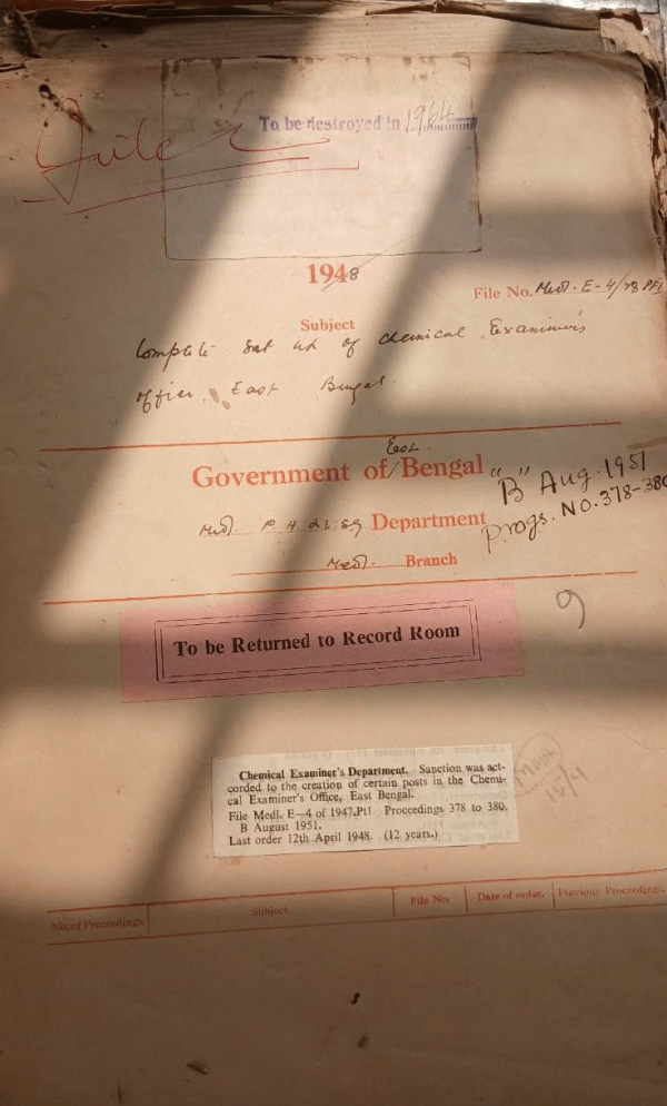 | Rack No. 09, Bundle No. 107, Sl No. 8806 Cutting from "Ittehed" (Mafasil edition) dated 2nd Ashar 1355 B.S. regarding Bansdah Charitable Dispensary. | Rack No. 09, Bundle No. 107, Sl No. 8807 Special sanction of Govt. for various contingent bills of the Dacca Medical College. | Rack No. 09, Bundle No. 107, Sl No. 8808 Setting up of a Bureau of Laboratories by Pakistan Govt. for supply of Vaccine. | Rack No. 09, Bundle No. 107, Sl No. 8809 Creation of certain posts in the Chemical Examiners office, East Bengal. | Rack No. 09, Bundle No. 107, Sl No. 8810 Acquisition of land for extension of the dispensary compound in front of Habibandha Dispensary (Rangpur). | Rack No. 09, Bundle No. 107, Sl No. 8811 Construction of an Animal house in the Compound of the | Rack No. 09, Bundle No. 107, Sl No. 8812 Admission of Students in the Chittagong Medical School during the session 1949-50. |