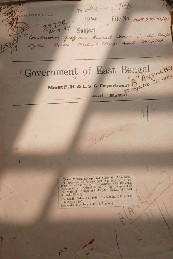 | Rack No. 09, Bundle No. 107, Sl No. 8808 Setting up of a Bureau of Laboratories by Pakistan Govt. for supply of Vaccine. | Rack No. 09, Bundle No. 107, Sl No. 8809 Creation of certain posts in the Chemical Examiners office, East Bengal. | Rack No. 09, Bundle No. 107, Sl No. 8810 Acquisition of land for extension of the dispensary compound in front of Habibandha Dispensary (Rangpur). | Rack No. 09, Bundle No. 107, Sl No. 8811 Construction of an Animal house in the Compound of the | Rack No. 09, Bundle No. 107, Sl No. 8812 Admission of Students in the Chittagong Medical School during the session 1949-50. | Rack No. 09, Bundle No. 107, Sl No. 8813 Purchase of six copies of Chopra Report on Indigenous System of Medicine. | Rack No. 09, Bundle No. 107, Sl No. 8814 Acquisition of land for construction of thana and rural dispensaries in the District of Mymensingh, Sylhet, Bakarganj and Chittagong. |