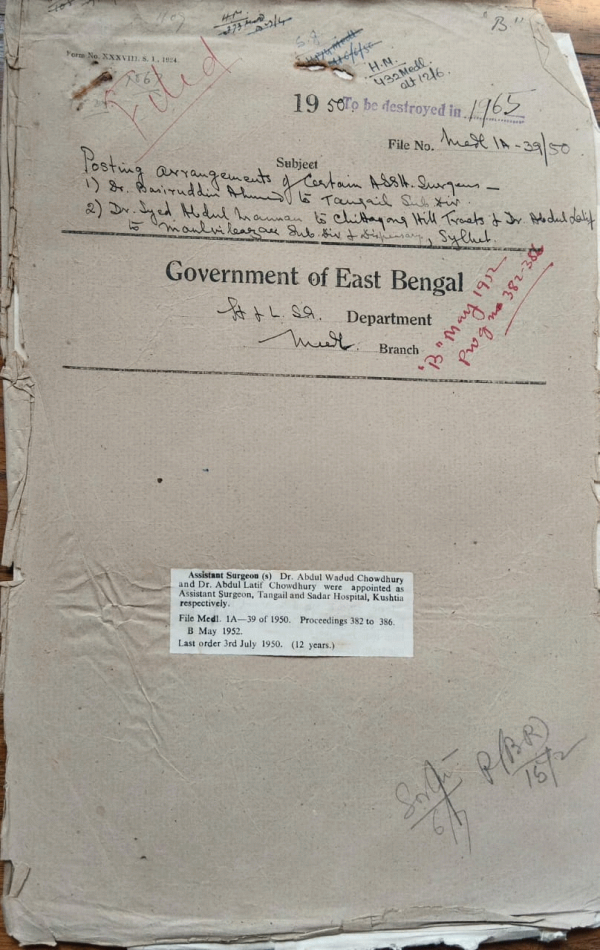 | Rack No. 9, Bundle No. 110, Sl No. 9028 Grant of special pay & conveyance allowance to S.A.S. Dr. Ranizuddin Ahmed M/O. govt. Hostel, Dacca. | Rack No. 9, Bundle No. 110, Sl No. 9029 Repairs to T.B. Segregation Hospital at Jessore, 1950-51. | Rack No. 9, Bundle No. 110, Sl No. 9030 Arrear pay of Mr. Hashibur Rahman award servant of Mitford Hospital, Dacca. | Rack No. 9, Bundle No. 110, Sl No. 9031 Posting arrangements of certain Assistant Surgeons to Chittagong Hill Tracts. | Rack No. 9, Bundle No. 110, Sl No. 9032 V.Rs. of Dr. Abul Khayer Khan and other, Assistant Surgeon in East Pakistan. | Rack No. 9, Bundle No. 110, Sl No. 9033 Sanction to the purchase of furniture for the Sylhet Medical School. | Rack No. 9, Bundle No. 110, Sl No. 9035 Additional and alterations in the existing Latrine of ward No. 1 in the Medical College, Dacca. |