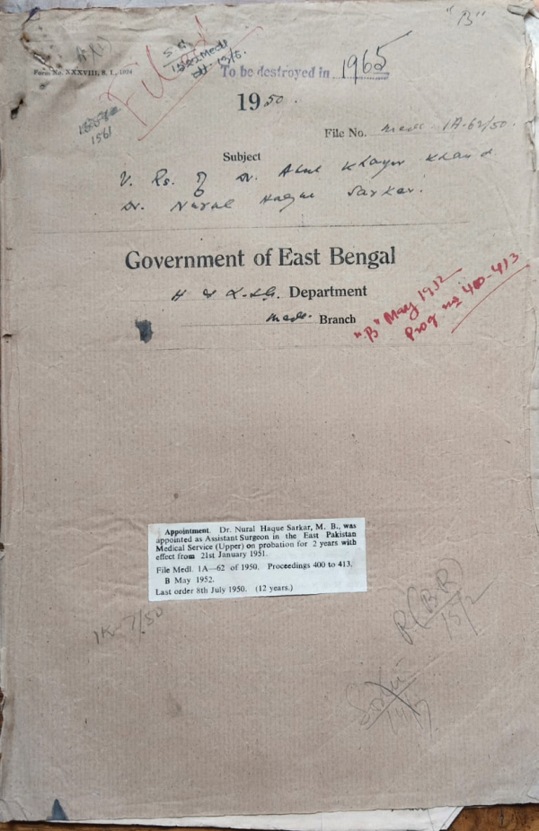 | Rack No. 9, Bundle No. 110, Sl No. 9029 Repairs to T.B. Segregation Hospital at Jessore, 1950-51. | Rack No. 9, Bundle No. 110, Sl No. 9030 Arrear pay of Mr. Hashibur Rahman award servant of Mitford Hospital, Dacca. | Rack No. 9, Bundle No. 110, Sl No. 9031 Posting arrangements of certain Assistant Surgeons to Chittagong Hill Tracts. | Rack No. 9, Bundle No. 110, Sl No. 9032 V.Rs. of Dr. Abul Khayer Khan and other, Assistant Surgeon in East Pakistan. | Rack No. 9, Bundle No. 110, Sl No. 9033 Sanction to the purchase of furniture for the Sylhet Medical School. | Rack No. 9, Bundle No. 110, Sl No. 9035 Additional and alterations in the existing Latrine of ward No. 1 in the Medical College, Dacca. | Rack No. 9, Bundle No. 110, Sl No. 9035 Posting arrangement of Certain Assistant, Surgeons. |