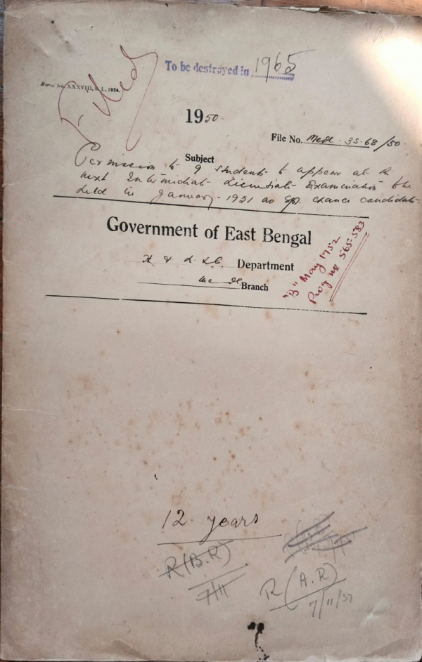 | Rack No. 9, Bundle No. 110, Sl No. 9035 Posting arrangement of Certain Assistant, Surgeons. | Rack No. 9, Bundle No. 110, Sl No. 9036 Electrification to the Store Cum Garage at Rajshahi. | Rack No. 9, Bundle No. 110, Sl No. 9037 Arrear real of the Tangail Hospital, Mymensingh. | Rack No. 9, Bundle No. 110, Sl No. 9038 Permission to 9 Students to appear at the next intermediate licentiate Examination. | Rack No. 9, Bundle No. 110, Sl No. 9039 I.M.S. officer in civil employ confidential Report. | Rack No. 9, Bundle No. 110, Sl No. 9040 Diet allowance in lieu of dearness allowance. | Rack No. 9, Bundle No. 110, Sl No. 9041 Construction Darwans shed in the student's hostel compound of Medical College. |