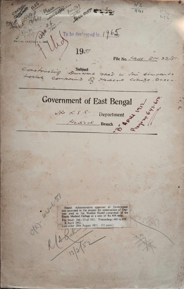 | Rack No. 9, Bundle No. 110, Sl No. 9038 Permission to 9 Students to appear at the next intermediate licentiate Examination. | Rack No. 9, Bundle No. 110, Sl No. 9039 I.M.S. officer in civil employ confidential Report. | Rack No. 9, Bundle No. 110, Sl No. 9040 Diet allowance in lieu of dearness allowance. | Rack No. 9, Bundle No. 110, Sl No. 9041 Construction Darwans shed in the student's hostel compound of Medical College. | Rack No. 9, Bundle No. 110, Sl No. 9042 Construction of thana dispensary at Patiya in the District of Chittagong. | Rack No. 9, Bundle No. 110, Sl No. 9043 Repairs of departmental structures and staff quarters attached to the Sadar Hospital Noakhali. | Rack No. 9, Bundle No. 110, Sl No. 9044 Supply of Oil Hydro corpus to the Baptist Mission Hospital, Chandragon, Chittagong. |
