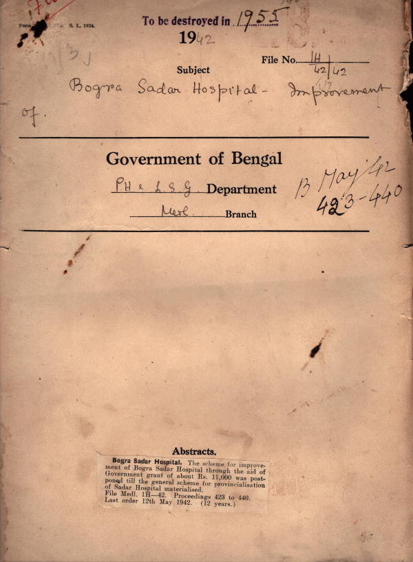 | Rack No. 09; Bundle No. 94 SL No. 7266 Medical Examination of Mvi. Kazi Khijir Ahmed a clerk of the Munsif's court, Ranaghat. | Rack No. 09; Bundle No. 94 SL No. 7267 Resignation of Dr. Krishna Chatterji from the Bengal Medical Service. | Rack No. 09; Bundle No. 94 SL No. 7268 Permanent appointment of Certain Sub-Assistant Surgeons. | Rack No. 09; Bundle No. 94 SL No. 7269 Bogra Sadar Hospital Improvement. | Rack No. 09; Bundle No. 94 SL No. 7270 Drugs testing of products of Private firms in the govt. and Semi Govt. Hospital. | Rack No. 09; Bundle No. 94 SL No. 7271 Special pay of Babu Haridas Ganguli for acting as 4th assistant Chemical Examiners | Rack No. 09; Bundle No. 94 SL No. 7272 Influx of German refugee Doctor in Calcutta |