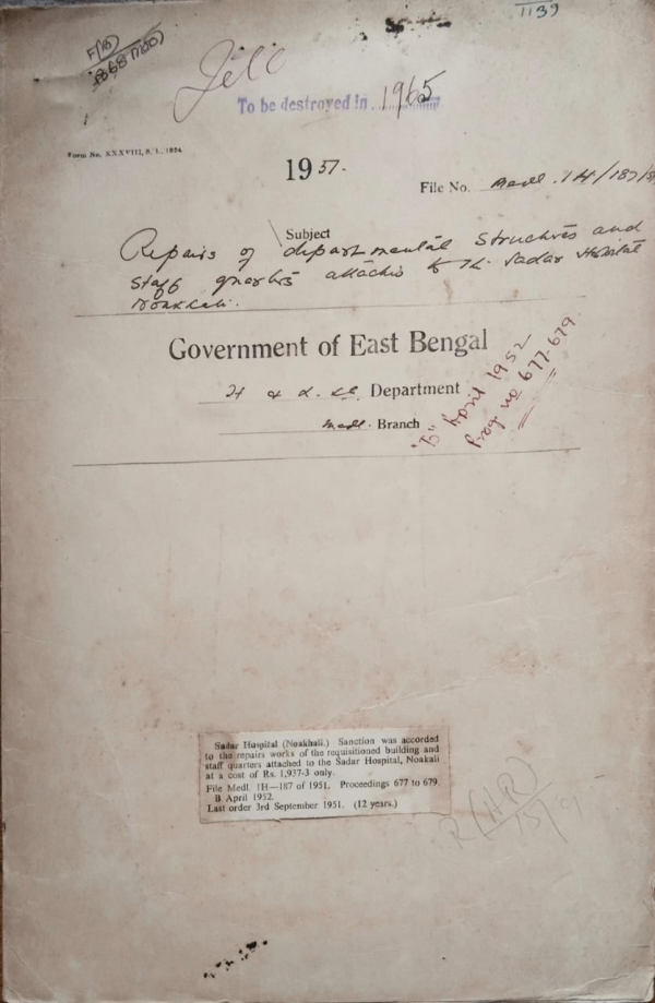 | Rack No. 9, Bundle No. 110, Sl No. 9040 Diet allowance in lieu of dearness allowance. | Rack No. 9, Bundle No. 110, Sl No. 9041 Construction Darwans shed in the student's hostel compound of Medical College. | Rack No. 9, Bundle No. 110, Sl No. 9042 Construction of thana dispensary at Patiya in the District of Chittagong. | Rack No. 9, Bundle No. 110, Sl No. 9043 Repairs of departmental structures and staff quarters attached to the Sadar Hospital Noakhali. | Rack No. 9, Bundle No. 110, Sl No. 9044 Supply of Oil Hydro corpus to the Baptist Mission Hospital, Chandragon, Chittagong. | Rack No. 9, Bundle No. 110, Sl No. 9045 Revision of pay scale of the Assistant Chemical Examiners Department, Dacca. | Rack No. 9, Bundle No. 110, Sl No. 9046 Supply of Medicines to Bottamby Home Orphanage, Tejgaon, Dacca. |