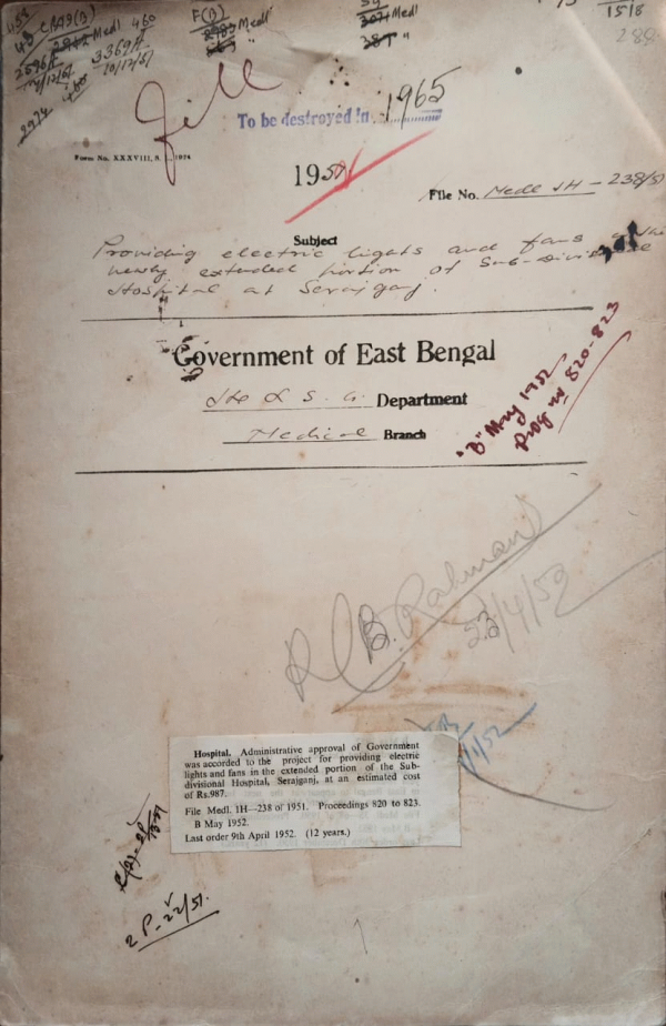 | Rack No. 9, Bundle No. 110, Sl No. 9048 Providing X.P. Metal in door shutters in Pharmacological Lab, Dacca Medical College. | Rack No. 9, Bundle No. 110, Sl No. 9049 Improvement to the Norail Sub-divisional Hospital, Jessore. | Rack No. 9, Bundle No. 110, Sl No. 9050 T.A. of Dr. W. Mahmood, Deputy Surgeon General to Chittagong to accompany the Russian Delegation | Rack No. 9, Bundle No. 110, Sl No. 9051 Providing electric light and Fans in the weekly extended Portion of Sub-Divisional Hospital, Serajganj. | Rack No. 9, Bundle No. 110, Sl No. 9052 Grant to the Gopalganj Hospital, Faridpur. | Rack No. 9, Bundle No. 110, Sl No. 9053 Retention of the post of Lady Doctor for the Sadar Hospital, Faridpur. | Rack No. 9, Bundle No. 110, Sl No. 9054 Construction of temporary sheds for additional accommodation of 100 more students of the Dacca Medical College. |