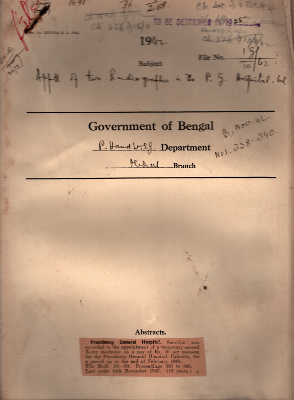 | Rack No. 09; Bundle No. 94 SL No. 7280 Crossing the efficiency for Dr. Wahiduddin Mahmud without attending the 2nd P.G. course of Training | Rack No. 09; Bundle No. 94 SL No. 7281 Appointment of staff for the Special Jail at Berhampore | Rack No. 09; Bundle No. 94 SL No. 7282 Communication to the Home Department of the G.I. of full particulars of enemy subjects who are in the private employment | Rack No. 09; Bundle No. 94 SL No. 7283 Appointment of two Radiographic in the P.G.H. Calcutta | Rack No. 09; Bundle No. 94 SL No. 7284 Retention of temporary establishment in the chemical examiners Department | Rack No. 09; Bundle No. 94 SL No. 7285 Agar control Order 1942 | Rack No. 09; Bundle No. 94 SL No. 7286 Relaxation of Rule of the state Medical Faculty, Bengal in favour of Md. Shamsul Huq, a student of the Campbell Medical School |
