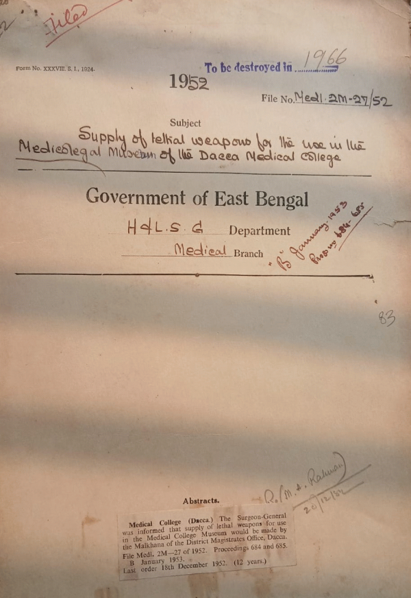 | Rack No. 10, Bundle No. 119 Sl No. 9880 Appointment of Dr. Sabahuddin Ahmed for the Post of an A/S. in the E.P.M.S. (Upper). | Rack No. 10, Bundle No. 119 Sl No. 9881 Sanction of a post of Night Guard cum Darwan for guarding the newly constructed C/S's office, Jessore. | Rack No. 10, Bundle No. 119 Sl No. 9882 Grant for the purchase of doors and almirahs for the newly started library for the patients of D.M.C.H. | Rack No. 10, Bundle No. 119 Sl No. 9883 Supply of lethal weapons for the use in the Medico legal Museum of the D.M.C. | Rack No. 10, Bundle No. 119 Sl No. 9884 Dr. M. Ameen, C/S. Mymensingh, Special Pay for holding charge of Superintendent, Mymensingh District Jail. | Rack No. 10, Bundle No. 119 Sl No. 9885 Appointment of Dr. Bipin Bihari Biswas, Superintendent Medical School, Dacca as teacher of Midwifery in addition to his own. | Rack No. 10, Bundle No. 119 Sl No. 9886 Writing off of the unserviceable and irreparable articles of the D.M.S. |