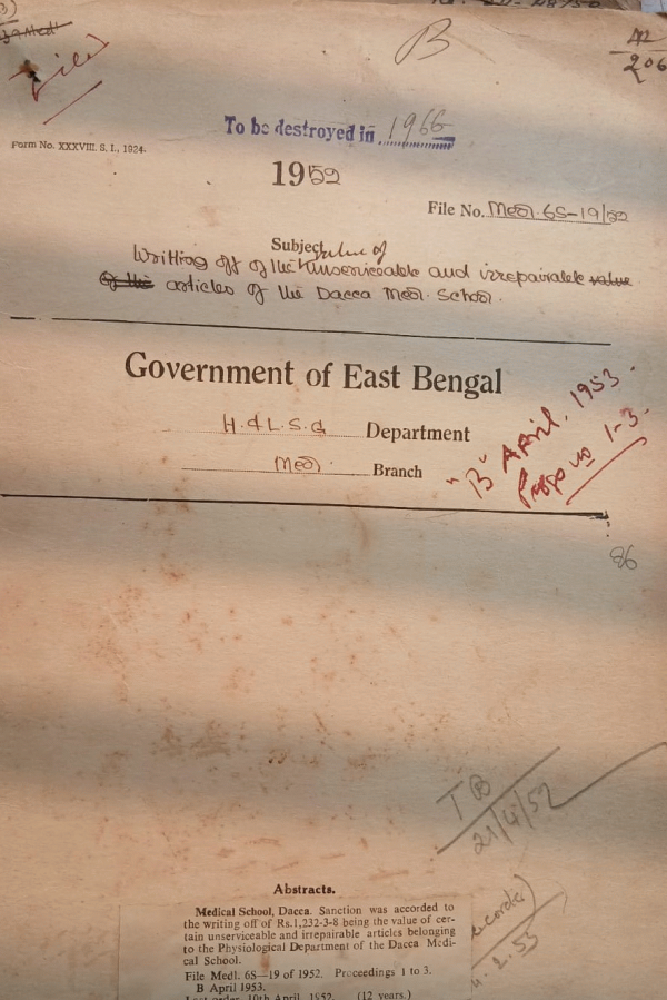 | Rack No. 10, Bundle No. 119 Sl No. 9883 Supply of lethal weapons for the use in the Medico legal Museum of the D.M.C. | Rack No. 10, Bundle No. 119 Sl No. 9884 Dr. M. Ameen, C/S. Mymensingh, Special Pay for holding charge of Superintendent, Mymensingh District Jail. | Rack No. 10, Bundle No. 119 Sl No. 9885 Appointment of Dr. Bipin Bihari Biswas, Superintendent Medical School, Dacca as teacher of Midwifery in addition to his own. | Rack No. 10, Bundle No. 119 Sl No. 9886 Writing off of the unserviceable and irreparable articles of the D.M.S. | Rack No. 10, Bundle No. 119 Sl No. 9887 Construction of quarters for the staff of C.M.S., Tejgaon. | Rack No. 10, Bundle No. 119 Sl No. 9888 Repairs of Dohar outdoor dispensary by C.E.P.H. | Rack No. 10, Bundle No. 119 Sl No. 9889 Passport and Visa System with India. |