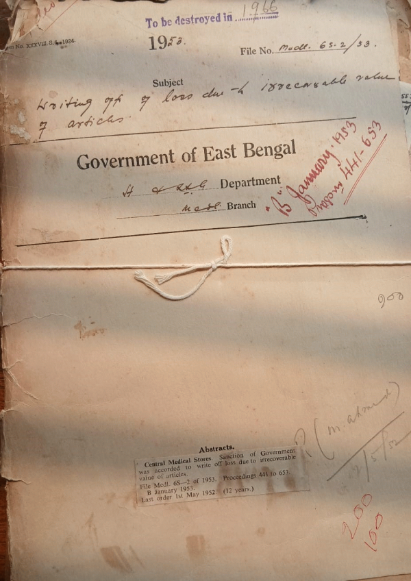 | Rack No. 10, Bundle No. 119 Sl No. 9897 Additional grant of Rs. 2,20,880/- under the head "63-B-Development D.M.C." | Rack No. 10, Bundle No. 119 Sl No. 9898 Striking off the roll of Md. Abul Hashem from the Medical college Dacca. | Rack No. 10, Bundle No. 119 Sl No. 9899 Special repairs to the Sub-Divisional Hospital, Chandpur for 1951-52. | Rack No. 10, Bundle No. 119 Sl No. 9900 Writing off of loss due to irrecoverable value of articles. | Rack No. 10, Bundle No. 120 Sl No. 9901 Acquisition of land for charitable Dispensary at Dewanhat in the village of Pathantooly. | Rack No. 10, Bundle No. 120 Sl No. 9902 Service Book or statement to temporary compounder Babu. J.C. Bhattacharjee of General Hospital Chittagong. | Rack No. 10, Bundle No. 120 Sl No. 9903 Expansion of from the extension of Feni Sub-Divisional Hospital Noakhali. |