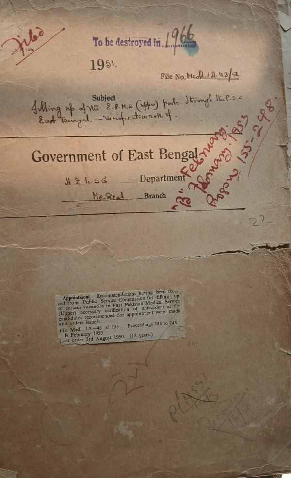 | Rack No. 10, Bundle No. 119 Sl No. 9899 Special repairs to the Sub-Divisional Hospital, Chandpur for 1951-52. | Rack No. 10, Bundle No. 119 Sl No. 9900 Writing off of loss due to irrecoverable value of articles. | Rack No. 10, Bundle No. 120 Sl No. 9901 Acquisition of land for charitable Dispensary at Dewanhat in the village of Pathantooly. | Rack No. 10, Bundle No. 120 Sl No. 9902 Service Book or statement to temporary compounder Babu. J.C. Bhattacharjee of General Hospital Chittagong. | Rack No. 10, Bundle No. 120 Sl No. 9903 Expansion of from the extension of Feni Sub-Divisional Hospital Noakhali. | Rack No. 10, Bundle No. 120 Sl No. 9904 Increase in the number of beds in the T.B. Ward. | Rack No. 10, Bundle No. 120 Sl No. 9905 Creation of a prayer room within the S.K. Hospital Compounder, Mymensingh. |