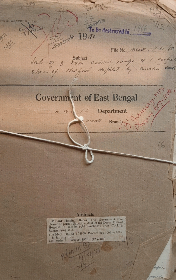| Rack No. 10, Bundle No. 120 Sl No. 9903 Expansion of from the extension of Feni Sub-Divisional Hospital Noakhali. | Rack No. 10, Bundle No. 120 Sl No. 9904 Increase in the number of beds in the T.B. Ward. | Rack No. 10, Bundle No. 120 Sl No. 9905 Creation of a prayer room within the S.K. Hospital Compounder, Mymensingh. | Rack No. 10, Bundle No. 120 Sl No. 9906 Arrear charges under the head "contract contingencies" for Rs. 354/- and Travelling Allowance for Rs. 95/- for Serajganj Prov. Hospital. | Rack No. 10, Bundle No. 120 Sl No. 9907 Dr. Mohd. Ibrahim Payment of air Passage. | Rack No. 10, Bundle No. 120 Sl No. 9908 Providing one wash hand basin in the office room of the Blood Bank Officer. | Rack No. 10, Bundle No. 120 Sl No. 9909 Procurement of an Indicator and incubator (22.e) for medical college Hospital. |