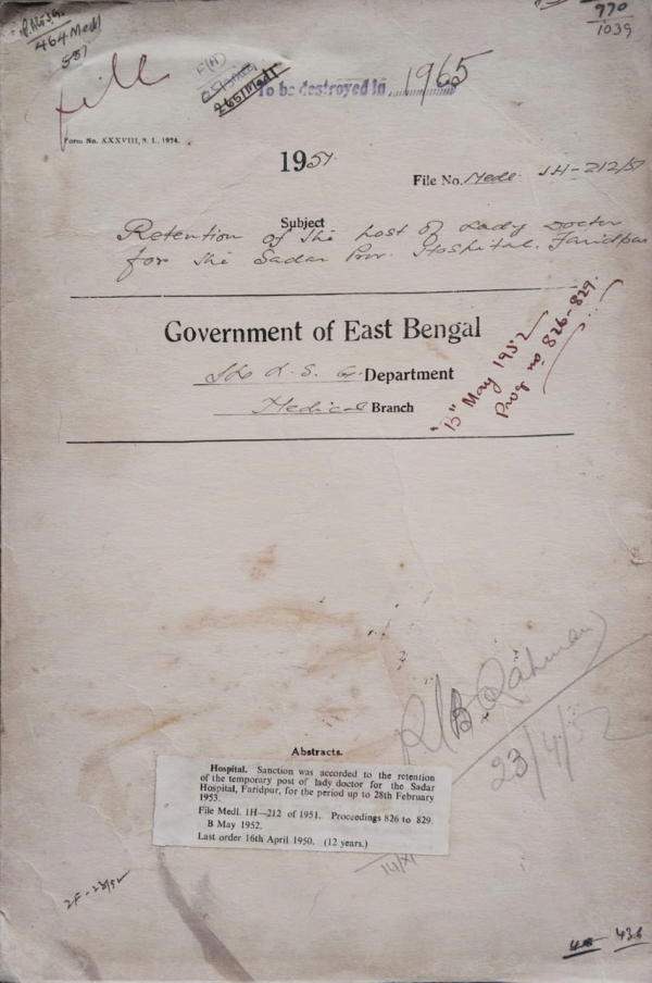 | Rack No. 9, Bundle No. 110, Sl No. 9050 T.A. of Dr. W. Mahmood, Deputy Surgeon General to Chittagong to accompany the Russian Delegation | Rack No. 9, Bundle No. 110, Sl No. 9051 Providing electric light and Fans in the weekly extended Portion of Sub-Divisional Hospital, Serajganj. | Rack No. 9, Bundle No. 110, Sl No. 9052 Grant to the Gopalganj Hospital, Faridpur. | Rack No. 9, Bundle No. 110, Sl No. 9053 Retention of the post of Lady Doctor for the Sadar Hospital, Faridpur. | Rack No. 9, Bundle No. 110, Sl No. 9054 Construction of temporary sheds for additional accommodation of 100 more students of the Dacca Medical College. | Rack No. 9, Bundle No. 110, Sl No. 9055 Certain improvement to Sub-Division Hospital at Thakurgaon, Dinajpur. | Rack No. 9, Bundle No. 110, Sl No. 9056 Sanction of teaching allowance to Dr. A.S. Chowdhury, Teacher of Midwifery, Dacca Medical School. |