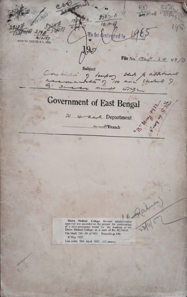Construction of temporary sheds for additional accommodation of 100 more students of the Dacca Medical College.