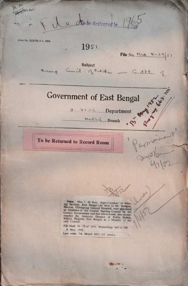 | Rack No. 9, Bundle No. 110, Sl No. 9059 Posting of Dr. W.A. Ansari and others Dacca Medical School to Lytton Medical School, Mymensingh. | Rack No. 9, Bundle No. 110, Sl No. 9060 Maintenance Charge of the non-criminal Mental Patient Harendra Chandra Pal. | Rack No. 9, Bundle No. 110, Sl No. 9061 Diet rate of patients of different wards of the State Hospitals. | Rack No. 9, Bundle No. 110, Sl No. 9062 Constitution of Nursing Council of Pakistan. | Rack No. 9, Bundle No. 110, Sl No. 9063 Posting of Dr. Meherunnisa and other in the Dacca Medical College Hospital. | Rack No. 9, Bundle No. 110, Sl No. 9064 Payment of the telephone charge for the C.S. offfice, Dinajpur. | Rack No. 9, Bundle No. 110, Sl No. 9065 Creation of a post of whole time peon, for the Sadar Hospital, Dinajpur. |