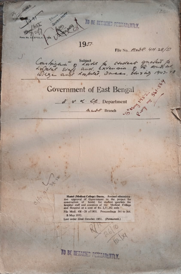 | Rack No. 9, Bundle No. 110, Sl No. 9063 Posting of Dr. Meherunnisa and other in the Dacca Medical College Hospital. | Rack No. 9, Bundle No. 110, Sl No. 9064 Payment of the telephone charge for the C.S. offfice, Dinajpur. | Rack No. 9, Bundle No. 110, Sl No. 9065 Creation of a post of whole time peon, for the Sadar Hospital, Dinajpur. | Rack No. 9, Bundle No. 110, Sl No. 9066 Construction of hostel for students quarters for hospital staff and extension of the Medical College, Dacca. | Rack No. 9, Bundle No. 110, Sl No. 9067 T.A. of the M/O.s accompanying refugees. | Rack No. 9, Bundle No. 110, Sl No. 9068 Sanction to the relation of the staff for the Provincial Hospital. | Rack No. 9, Bundle No. 110, Sl No. 9069 Sinking of a tube-well in S.A.'S quarter attached to the Leper Asylum, Sylhet. |