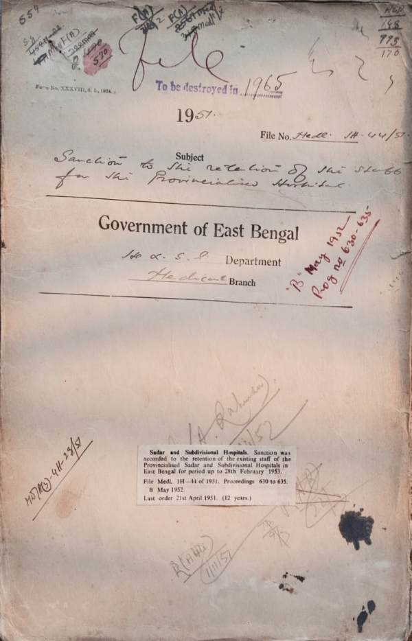 | Rack No. 9, Bundle No. 110, Sl No. 9065 Creation of a post of whole time peon, for the Sadar Hospital, Dinajpur. | Rack No. 9, Bundle No. 110, Sl No. 9066 Construction of hostel for students quarters for hospital staff and extension of the Medical College, Dacca. | Rack No. 9, Bundle No. 110, Sl No. 9067 T.A. of the M/O.s accompanying refugees. | Rack No. 9, Bundle No. 110, Sl No. 9068 Sanction to the relation of the staff for the Provincial Hospital. | Rack No. 9, Bundle No. 110, Sl No. 9069 Sinking of a tube-well in S.A.'S quarter attached to the Leper Asylum, Sylhet. | Rack No. 9, Bundle No. 110, Sl No. 9070 Retention of temporary staff in the offices of the Civil Surgeons in connection with the A.G. Hospital Works. | Rack No. 9, Bundle No. 110, Sl No. 9071 Sancting T.A. & D.A. to Mr. K.C. Chakravary, Secretary, Red Cross Society, Barisal. |