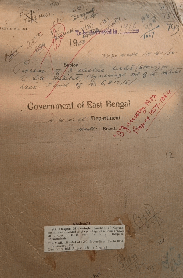| Rack No. 10, Bundle No. 120 Sl No. 9909 Procurement of an Indicator and incubator (22.e) for medical college Hospital. | Rack No. 10, Bundle No. 120 Sl No. 9910 Abolishment of Posts of Hon. House Surgeon and creation of 2 Posts of whale time resident Sub-Assistant Surgeon in the Barisal Sadar Prov. Hospital. | Rack No. 10, Bundle No. 120 Sl No. 9911 Payment of arrear bill of M/S. Haque Brothers and may and Baker Ltd. Dacca. | Rack No. 10, Bundle No. 120 Sl No. 9912 Purchase of 4 electric heaters out of the Hospital week fund. | Rack No. 10, Bundle No. 120 Sl No. 9913 Counting of previous service of Mvi. Abdul Whab L.D. Assistant of the Medical Directorate. | Rack No. 10, Bundle No. 120 Sl No. 9914 The East Bengal Profession trades, Collage and employments creation Rules 1950 | Rack No. 10, Bundle No. 120 Sl No. 9915 Surrendered of savings to govt. form the grants placed at the disposal of S.G.E.B. |