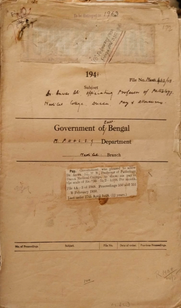 Dr. Anwar Ali, officiating professor of Pathology medical College, Dacca pay and allowance.
