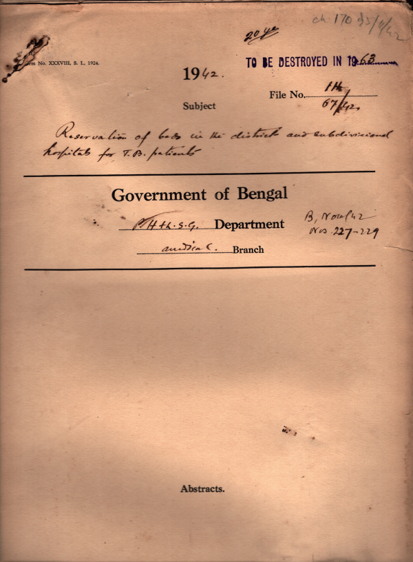 | Rack No. 09; Bundle No. 94 SL No. 7285 Agar control Order 1942 | Rack No. 09; Bundle No. 94 SL No. 7286 Relaxation of Rule of the state Medical Faculty, Bengal in favour of Md. Shamsul Huq, a student of the Campbell Medical School | Rack No. 09; Bundle No. 94 SL No. 7287 Appointment of a menial for the Physiology Department of the Jalpaiguri Medical School | Rack No. 09; Bundle No. 94 SL No. 7288 Reservation of beds in District and Sub-divisional Hospitals for T.B. patients | Rack No. 09; Bundle No. 94 SL No. 7289 Contribution payable by the Govt. of Bengal on accounts of maintenance charges of the Indian Mental Hospital, Ranchi for 1941-42 | Rack No. 09; Bundle No. 94 SL No. 7290 Posting of Major Fisher I.M.S. and Dr. K.M. Basu | Rack No. 09; Bundle No. 94 SL No. 7291 Payments for supply of beef to the P.G. Hospital by late Haji Abdur Rahman |