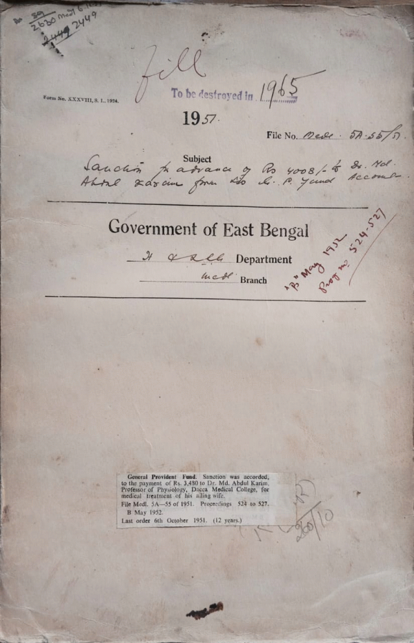 | Rack No. 9, Bundle No. 110, Sl No. 9070 Retention of temporary staff in the offices of the Civil Surgeons in connection with the A.G. Hospital Works. | Rack No. 9, Bundle No. 110, Sl No. 9071 Sancting T.A. & D.A. to Mr. K.C. Chakravary, Secretary, Red Cross Society, Barisal. | Rack No. 9, Bundle No. 110, Sl No. 9072 House rent allowance to Dr. Md. Habibullah, M/O, CMS. Tejgaon. | Rack No. 9, Bundle No. 110, Sl No. 9073 Sanction for advance to Dr. Md. A. Karim from his G.P.F. | Rack No. 9, Bundle No. 110, Sl No. 9074 Appointment of Dr. Md. Nasir Udding M.B.D.P.H., A.D. PH. as Profession of Hygienic, Dacca Medical College. | Rack No. 9, Bundle No. 110, Sl No. 9075 Retention of the post of additional clerks in Each of the office of the Civil Surgeons, East Bengal. | Rack No. 9, Bundle No. 110, Sl No. 9076 Construction of a hanging self (Macha) in the District Reserve store, Faridpur. |