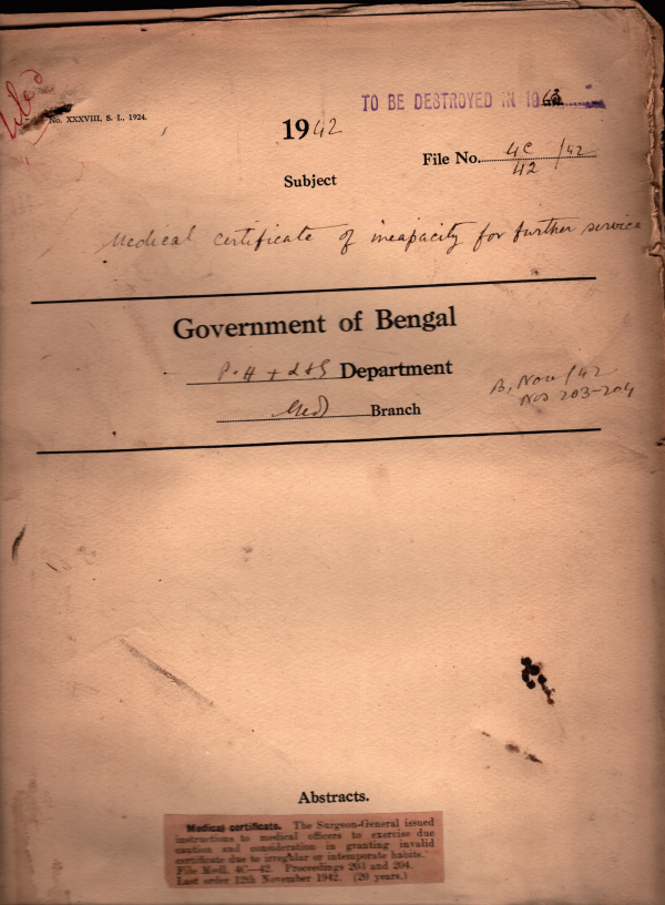 | Rack No. 09; Bundle No. 94 SL No. 7293 Execution of Petty workers and repairs in the existing building by the Civil authorities | Rack No. 09; Bundle No. 94 SL No. 7294 Extension of tenure of Department of Dr. Banbehari Adak, Registrar on the Medical side, M.C.H. Calcutta | Rack No. 09; Bundle No. 94 SL No. 7295 Allowance to S.A.S. Dr. Naresh Chakraverty for doing X-ray work in the Woodburn Hospital, Kulna | Rack No. 09; Bundle No. 94 SL No. 7296 Medical Certificate of incapacity for further service | Rack No. 09; Bundle No. 94 SL No. 7297 Modification of the D.T.M. Exam. Rules | Rack No. 09; Bundle No. 94 SL No. 7298 Establishment of a separate infectious diseases Hospital at Dacca | Rack No. 09; Bundle No. 94 SL No. 7299 Reservation of a seat for a Civil Assistant Surgeon of Assam for training in X-ray works at the M.C.H Calcutta |