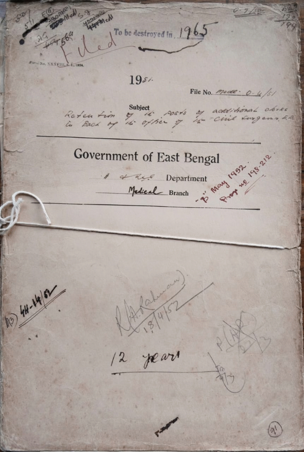 | Rack No. 9, Bundle No. 110, Sl No. 9072 House rent allowance to Dr. Md. Habibullah, M/O, CMS. Tejgaon. | Rack No. 9, Bundle No. 110, Sl No. 9073 Sanction for advance to Dr. Md. A. Karim from his G.P.F. | Rack No. 9, Bundle No. 110, Sl No. 9074 Appointment of Dr. Md. Nasir Udding M.B.D.P.H., A.D. PH. as Profession of Hygienic, Dacca Medical College. | Rack No. 9, Bundle No. 110, Sl No. 9075 Retention of the post of additional clerks in Each of the office of the Civil Surgeons, East Bengal. | Rack No. 9, Bundle No. 110, Sl No. 9076 Construction of a hanging self (Macha) in the District Reserve store, Faridpur. | Rack No. 9, Bundle No. 110, Sl No. 9077 Sanction of house rent to the M/O, Khan-Khanapur outdoor dispensary, Faridpur. | Rack No. 9, Bundle No. 110, Sl No. 9078 The Contract of Major F.W. Allinson, Prof. of Surgery, Dacca Medical College. |