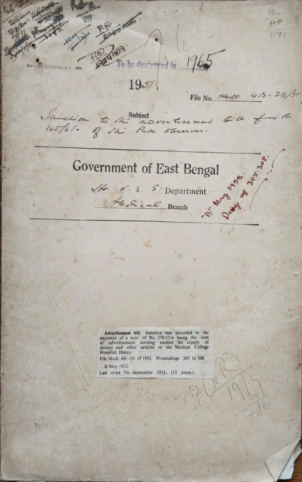 | Rack No. 9, Bundle No. 110, Sl No. 9076 Construction of a hanging self (Macha) in the District Reserve store, Faridpur. | Rack No. 9, Bundle No. 110, Sl No. 9077 Sanction of house rent to the M/O, Khan-Khanapur outdoor dispensary, Faridpur. | Rack No. 9, Bundle No. 110, Sl No. 9078 The Contract of Major F.W. Allinson, Prof. of Surgery, Dacca Medical College. | Rack No. 9, Bundle No. 110, Sl No. 9079 Sanction to the advertisement file of the Pakistan Observer. | Rack No. 9, Bundle No. 110, Sl No. 9080 Creation of a Separate post of Muslim Cook for the Rangamati Sadar Hospital, Chittagong Hill Tracts. | Rack No. 9, Bundle No. 110, Sl No. 9081 Re-fixation of pay under the East Bengal Services Rules 1950. | Rack No. 9, Bundle No. 110, Sl No. 9082 Change of name of Md. Hasanuddin Biswas Dr. M. Hasan, Surgeon of the E.P.M.S. (Upper). |