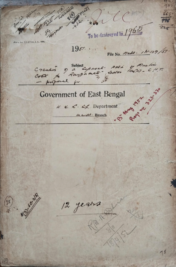 | Rack No. 9, Bundle No. 110, Sl No. 9077 Sanction of house rent to the M/O, Khan-Khanapur outdoor dispensary, Faridpur. | Rack No. 9, Bundle No. 110, Sl No. 9078 The Contract of Major F.W. Allinson, Prof. of Surgery, Dacca Medical College. | Rack No. 9, Bundle No. 110, Sl No. 9079 Sanction to the advertisement file of the Pakistan Observer. | Rack No. 9, Bundle No. 110, Sl No. 9080 Creation of a Separate post of Muslim Cook for the Rangamati Sadar Hospital, Chittagong Hill Tracts. | Rack No. 9, Bundle No. 110, Sl No. 9081 Re-fixation of pay under the East Bengal Services Rules 1950. | Rack No. 9, Bundle No. 110, Sl No. 9082 Change of name of Md. Hasanuddin Biswas Dr. M. Hasan, Surgeon of the E.P.M.S. (Upper). | Rack No. 9, Bundle No. 110, Sl No. 9083 Purchase of 3 Microscopes for the govt. Tibbia College Sylhet. |
