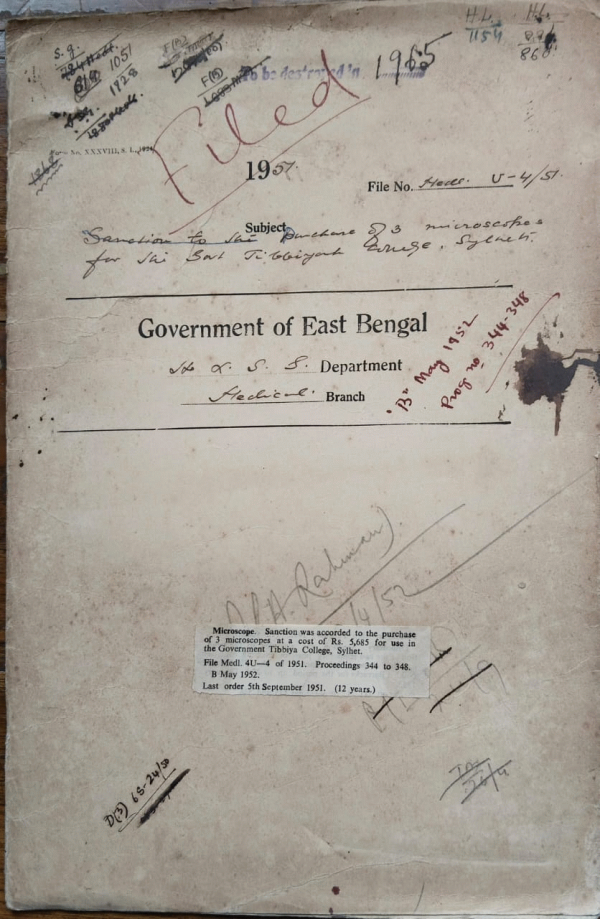 | Rack No. 9, Bundle No. 110, Sl No. 9080 Creation of a Separate post of Muslim Cook for the Rangamati Sadar Hospital, Chittagong Hill Tracts. | Rack No. 9, Bundle No. 110, Sl No. 9081 Re-fixation of pay under the East Bengal Services Rules 1950. | Rack No. 9, Bundle No. 110, Sl No. 9082 Change of name of Md. Hasanuddin Biswas Dr. M. Hasan, Surgeon of the E.P.M.S. (Upper). | Rack No. 9, Bundle No. 110, Sl No. 9083 Purchase of 3 Microscopes for the govt. Tibbia College Sylhet. | Rack No. 9, Bundle No. 110, Sl No. 9084 House rent allowance to the Medical officer Saidpur outdoor dispensary. | Rack No. 9, Bundle No. 110, Sl No. 9085 Case of accused Prafulla Kumar Datta in the Barisal Jail. | Rack No. 9, Bundle No. 110, Sl No. 9086 Proposal for Providing a balcony in the existing Dissection Hall attached to the Dacca Medical College. |