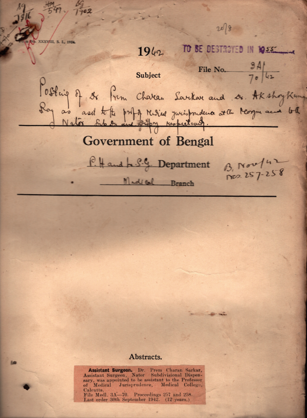 | Rack No. 09; Bundle No. 94 SL No. 7307 Admissibility separation allowance to Govt. servants when they are in the midst of their families. | Rack No. 09; Bundle No. 94 SL No. 7308 Appointment of members of the committee of the Hospital, Darjeeling | Rack No. 09; Bundle No. 94 SL No. 7309 Prasannamoyee Charitable Dispensary Fund | Rack No. 09; Bundle No. 94 SL No. 7310 Posting of Dr. Prem Charan Sarker and Dr. Akshoy Kumar Roy as Assistant to the Professor of Medical Jurisprudence at the Natore Sub-division and Dispensary | Rack No. 09; Bundle No. 94 SL No. 7311 Requisition of water transport | Rack No. 09; Bundle No. 94 SL No. 7312 Additional remuneration to the S.A.S. Dr. B.K. Bose, R.M.O Mackenzie ‘A’ ward of the Campbell Hospital, Calcutta | Rack No. 09; Bundle No. 94 SL No. 7313 Extension of tenure of appointment of Dr. A.C. Ukil, M.BM.S.P.E (Paris) Honorary Physician, Calcutta Medical College Hospital |