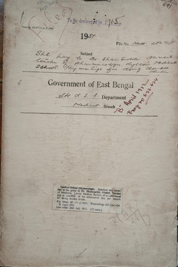 | Rack No. 9, Bundle No. 110, Sl No. 9091 Occupation of the D.B. land at Lakhipur for A.G. Hospital. | Rack No. 9, Bundle No. 110, Sl No. 9092 Retention of the post of an additional for the Chittagong Medical School. | Rack No. 9, Bundle No. 110, Sl No. 9093 Preparation claim relating to Special Scholarships to the Students of the Dacca Medical School. | Rack No. 9, Bundle No. 110, Sl No. 9094 Special pay to Dr. Samsuddin Ahmed teacher of Pharmacology Lytton Medical School, Mymensingh. | Rack No. 9, Bundle No. 110, Sl No. 9095 Purchase of an instrument & Cabinet for the new operation of the several Hospital, Chittagong. | Rack No. 9, Bundle No. 110, Sl No. 9096 Annual Ameen Health Visitor in the Chest Department of the Mitford Hospital. | Rack No. 9, Bundle No. 110, Sl No. 9097 Terms to be allowed to govt. officers proceedings to Place Pakistan Official Business. |