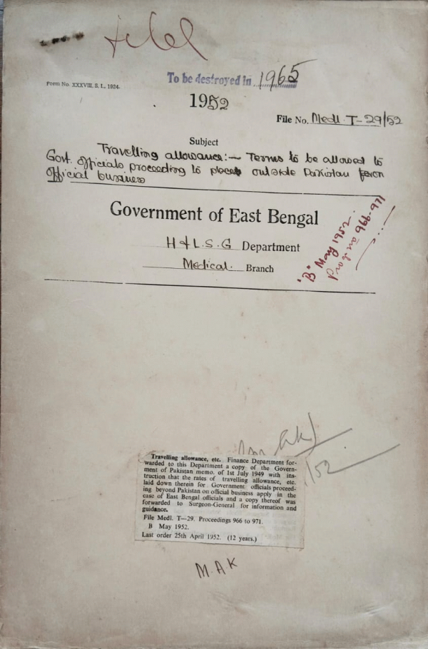 | Rack No. 9, Bundle No. 110, Sl No. 9094 Special pay to Dr. Samsuddin Ahmed teacher of Pharmacology Lytton Medical School, Mymensingh. | Rack No. 9, Bundle No. 110, Sl No. 9095 Purchase of an instrument & Cabinet for the new operation of the several Hospital, Chittagong. | Rack No. 9, Bundle No. 110, Sl No. 9096 Annual Ameen Health Visitor in the Chest Department of the Mitford Hospital. | Rack No. 9, Bundle No. 110, Sl No. 9097 Terms to be allowed to govt. officers proceedings to Place Pakistan Official Business. | Rack No. 9, Bundle No. 110, Sl No. 9098 Appointment of the Sub-Divisional M/O as member of the Maulvi Bazar Municipality, Sylhet. | Rack No. 9, Bundle No. 110, Sl No. 9099 Retention of the post of Muslim Hospital, Sylhet. | Rack No. 9, Bundle No. 110, Sl No. 9100 Retention of the V.D. Clinic of Dacca Chittagong and Comilla. |