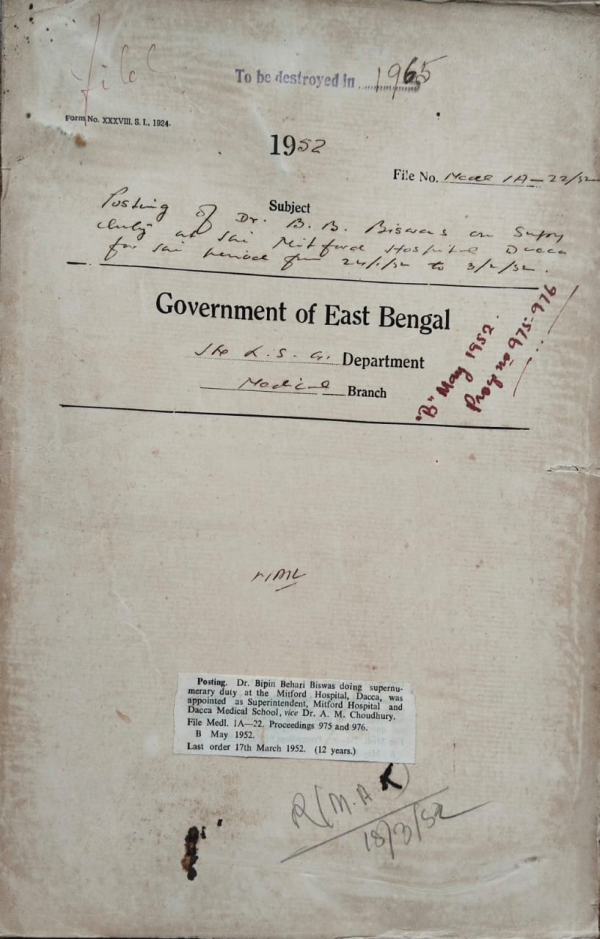 | Rack No. 9, Bundle No. 110, Sl No. 9098 Appointment of the Sub-Divisional M/O as member of the Maulvi Bazar Municipality, Sylhet. | Rack No. 9, Bundle No. 110, Sl No. 9099 Retention of the post of Muslim Hospital, Sylhet. | Rack No. 9, Bundle No. 110, Sl No. 9100 Retention of the V.D. Clinic of Dacca Chittagong and Comilla. | Rack No. 9, Bundle No. 110, Sl No. 9101 Posting of Dr. B.B. Biswas on supernumerary duty at the Mitford Hospital, Dacca. | Rack No. 9, Bundle No. 110, Sl No. 9102 Permission to Mvi. Mansur Hossain Ahmed a Student of the Dacca Medical School to appear in the Examination. | Rack No. 9, Bundle No. 110, Sl No. 9103 Grant of special pay of Mvi. Serajul Haque, 2nd clerk, Dacca Medical College. | Rack No. 9, Bundle No. 110, Sl No. 9104 Construction of residential quarters for the civil Surgeon Tippera. |