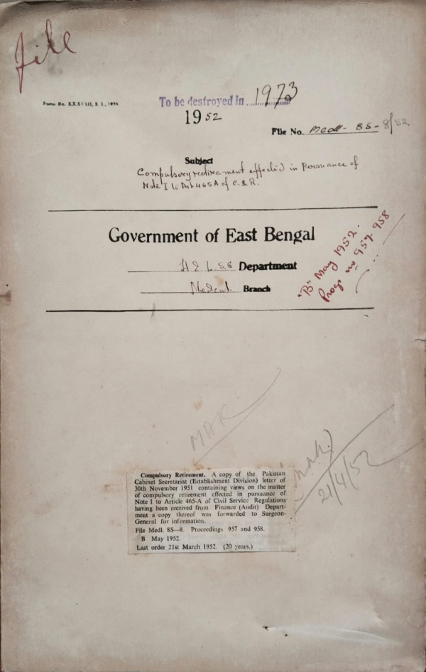 | Rack No. 9, Bundle No. 110, Sl No. 9103 Grant of special pay of Mvi. Serajul Haque, 2nd clerk, Dacca Medical College. | Rack No. 9, Bundle No. 110, Sl No. 9104 Construction of residential quarters for the civil Surgeon Tippera. | Rack No. 9, Bundle No. 110, Sl No. 9105 Suspension of Mr. Akbal Ali L.S.C. govt. employees. | Rack No. 9, Bundle No. 110, Sl No. 9106 Compulsory retirement effected in pursuance of Not I Article 465A of Civil Service Regulations. | Rack No. 9, Bundle No. 110, Sl No. 9107 Bill-finance Bill, 1952 Court fees Livable on appeals under the See customs and central Excises and Salt acts Enhancement. | Rack No. 9, Bundle No. 110, Sl No. 9108 Extension of joining time of Dr. A.K.M. Salahuddin, Mymensingh S.K. Hospital. | Rack No. 9, Bundle No. 110, Sl No. 9109 Purchase of furniture for the Mitford Hospital, Dacca. |