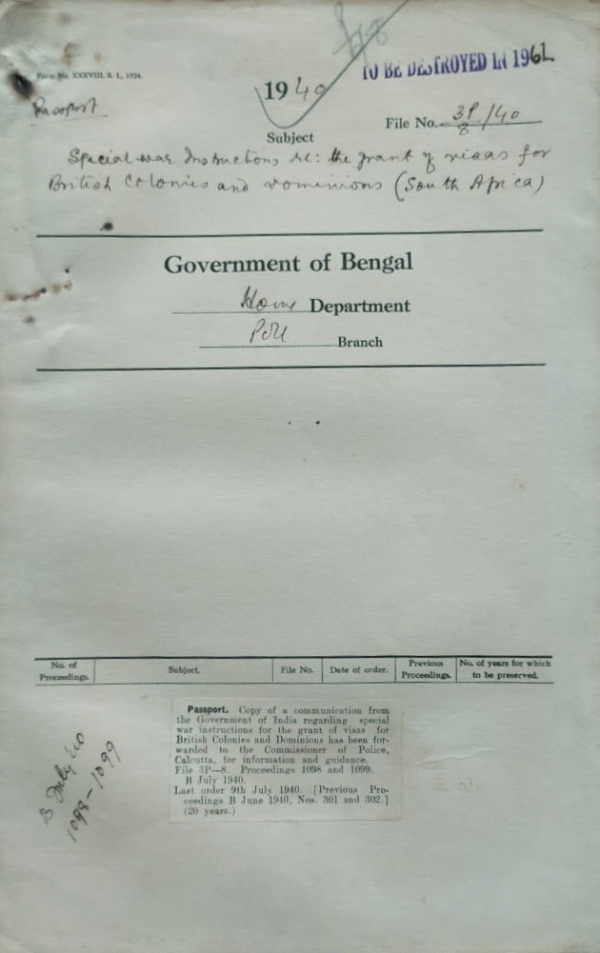 | Rack No. 42, Bundle No. 08, Sl No. 570 Application from Dr. P. Chatt for assistance to proceed to India with his wife. | Rack No. 42, Bundle No. 08, Sl No. 571 The Decree number 3116 issued of Travel Documents by the Cuban govt. | Rack No. 42, Bundle No. 08, Sl No. 572 Grant of travel facilities for Burma to Mr. Rudoif Roelz & his wife, an American National. | Rack No. 42, Bundle No. 08, Sl No. 573 Special War Instruction regarding the grant of visas for British Colonies & Dominions (South Africa). | Rack No. 42, Bundle No. 08, Sl No. 574 Requirements of certificate of Character & British Subjects applying for a visa for the U.S.A. & Brazil. | Rack No. 42, Bundle No. 08, Sl No. 575 Requisition of Acquisition of land for construction of house for refugee families at salgaria in the district of Pabna. | Rack No. 44, Bundle No. 01, Sl No. 02 Absorption of Mr. Md. Wali Ahmed Bhuiyan, surplus steno typist of erstwhile Government of Pakistan. |