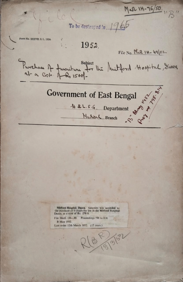 | Rack No. 9, Bundle No. 110, Sl No. 9106 Compulsory retirement effected in pursuance of Not I Article 465A of Civil Service Regulations. | Rack No. 9, Bundle No. 110, Sl No. 9107 Bill-finance Bill, 1952 Court fees Livable on appeals under the See customs and central Excises and Salt acts Enhancement. | Rack No. 9, Bundle No. 110, Sl No. 9108 Extension of joining time of Dr. A.K.M. Salahuddin, Mymensingh S.K. Hospital. | Rack No. 9, Bundle No. 110, Sl No. 9109 Purchase of furniture for the Mitford Hospital, Dacca. | Rack No. 9, Bundle No. 110, Sl No. 9111 Supply of medicines to Kumudini Hospital, Mymensingh. | Rack No. 9, Bundle No. 110, Sl No. 9111 Supply of medicines to the Ahsanullah Engineering College Dacca. | Rack No. 9, Bundle No. 110, Sl No. 9112 Sanction of Rs. 2000/- as educational grant to the M.C. College, Sylhet. |