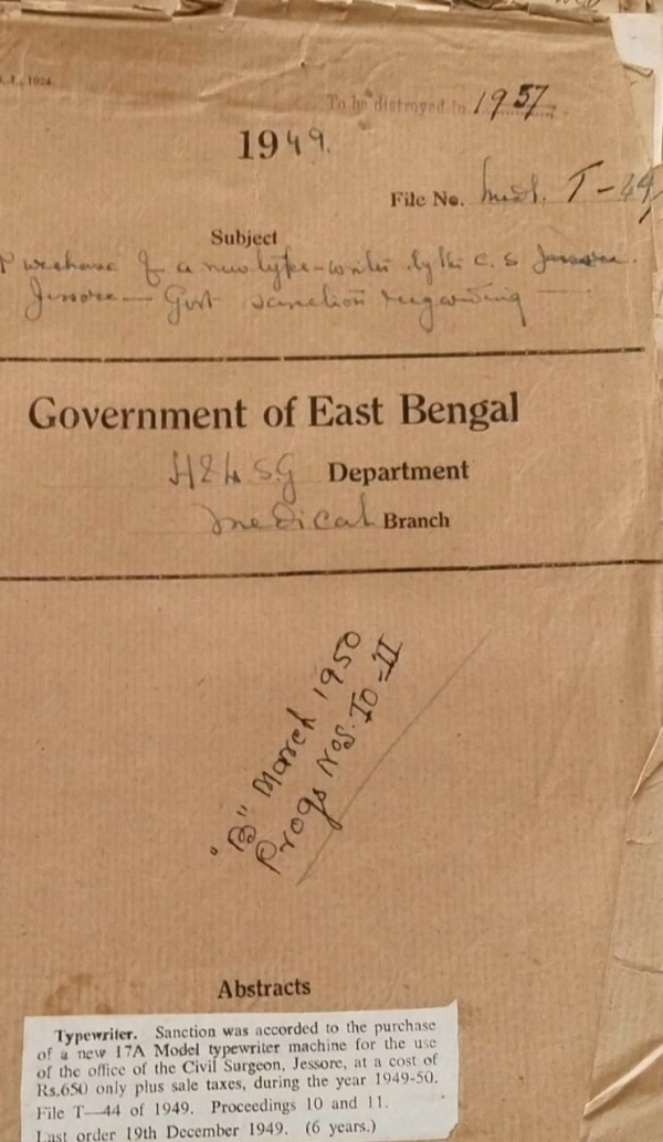 Purchase of a new type-written by the C.S. Jessore Govt. Sanction regarding.