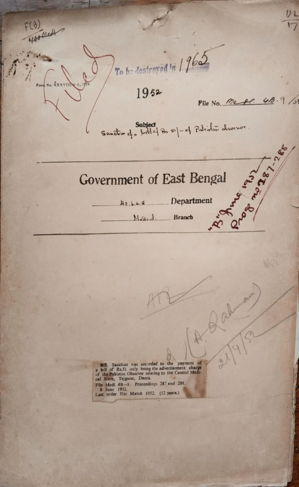 | Rack No. 9, Bundle No. 110, Sl No. 9111 Supply of medicines to Kumudini Hospital, Mymensingh. | Rack No. 9, Bundle No. 110, Sl No. 9111 Supply of medicines to the Ahsanullah Engineering College Dacca. | Rack No. 9, Bundle No. 110, Sl No. 9112 Sanction of Rs. 2000/- as educational grant to the M.C. College, Sylhet. | Rack No. 9, Bundle No. 110, Sl No. 9113 Sanction of a bill of Pakistan Observer. | Rack No. 9, Bundle No. 110, Sl No. 9114 Instruction regarding the distribution of diploma by the State Faculty, W/Bengal to the District Magistrate, Dacca. | Rack No. 9, Bundle No. 110, Sl No. 9115 Filling up to vacancies in the C.D General Instruction course. | Rack No. 9, Bundle No. 110, Sl No. 9116 Repatriation of non-criminal mental patients Mohendra Chandra Deb Nath. |