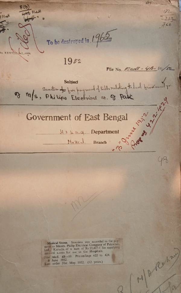| Rack No. 10, Bundle No. 120 Sl No. 9945 She. hay of Dr. Shahadut Ali Khan, A/S. Sadur Hospital Bogra for drugs additional work. | Rack No. 10, Bundle No. 120 Sl No. 9946 Sending delegate to attend the health congress to be held in Mar gate form 22nd to 25 April 1952. | Rack No. 10, Bundle No. 120 Sl No. 9947 Sanction of motor car advance to govt. servants Instruction in connection work. | Rack No. 10, Bundle No. 120 Sl No. 9948 Sanction for payment of bills relating to last financial year. | Rack No. 10, Bundle No. 120 Sl No. 9949 Purchase of X-ray Parts and Installation of 7.5 K.V.A. Rotary converter and one 30" of cussed grid in X-ray Room at Mitford Hospital, Dacca. | Rack No. 10, Bundle No. 120 Sl No. 9950 Fixation of pay of the clerks of Sub-Divisional Pro. Hospital at Rajbari and Gapalganj, Faridpur. | Rack No. 10, Bundle No. 120 Sl No. 9951 Sanction of house rent allowance of Dr. Karam Ali, Dohazari rural dispensary, Chittagong. |