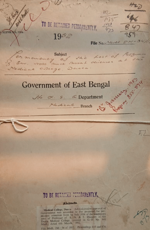 Recruitment to a temporary post of professor of Ear, Nose, and throat diseases in the Dacca Medical College.