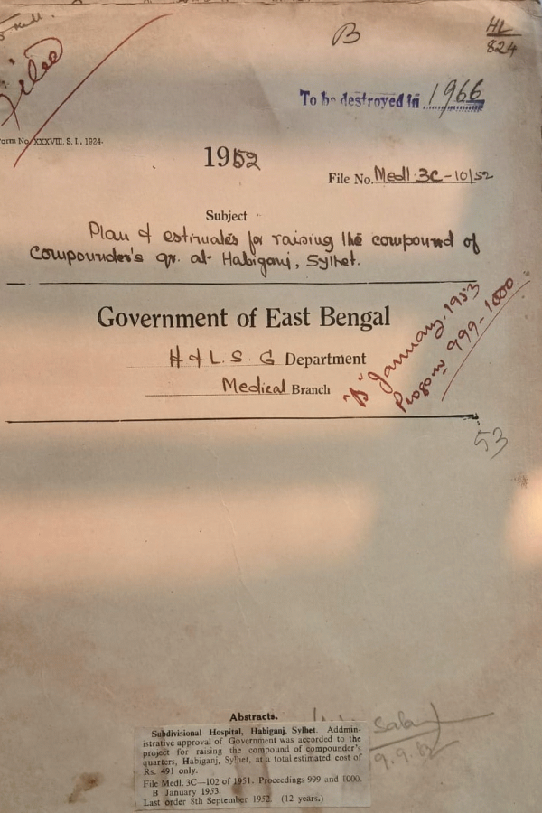 | Rack No. 10, Bundle No. 120 Sl No. 9950 Fixation of pay of the clerks of Sub-Divisional Pro. Hospital at Rajbari and Gapalganj, Faridpur. | Rack No. 10, Bundle No. 120 Sl No. 9951 Sanction of house rent allowance of Dr. Karam Ali, Dohazari rural dispensary, Chittagong. | Rack No. 10, Bundle No. 120 Sl No. 9952 Recruitment to a temporary post of professor of Ear, Nose, and throat diseases in the Dacca Medical College. | Rack No. 10, Bundle No. 120 Sl No. 9953 Plan of estimates for Raising the compound of compounder's quarters at Habigonj, Sylhet. | Rack No. 10, Bundle No. 120 Sl No. 9954 Arrear land rent of Ramoo Thana Dispensary Chittagong. | Rack No. 10, Bundle No. 120 Sl No. 9955 Supply of medical stores to Kumudini Hospital. | Rack No. 10, Bundle No. 120 Sl No. 9956 Improvement to Sub-Divisional Hospital at B. Baria in the District of Tippera. |