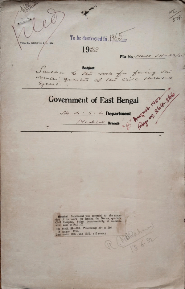| Rack No. 9, Bundle No. 110, Sl No. 9114 Instruction regarding the distribution of diploma by the State Faculty, W/Bengal to the District Magistrate, Dacca. | Rack No. 9, Bundle No. 110, Sl No. 9115 Filling up to vacancies in the C.D General Instruction course. | Rack No. 9, Bundle No. 110, Sl No. 9116 Repatriation of non-criminal mental patients Mohendra Chandra Deb Nath. | Rack No. 9, Bundle No. 110, Sl No. 9117 Sanction to the work for fencing the Nurses quarters of the Civil Hospital, Sylhet. | Rack No. 9, Bundle No. 110, Sl No. 9118 Grant by H.M. Agriculture Department to the Dacca Medical College Hospital Patients Library. | Rack No. 9, Bundle No. 110, Sl No. 9119 Resignation of Dr. Birendra Lal Das M/O, Mohipur Dispensary in the District of Bakarganj. | Rack No. 9, Bundle No. 110, Sl No. 9120 Award of scholarships to the hill boys to prosecute studies in Medicine. |
