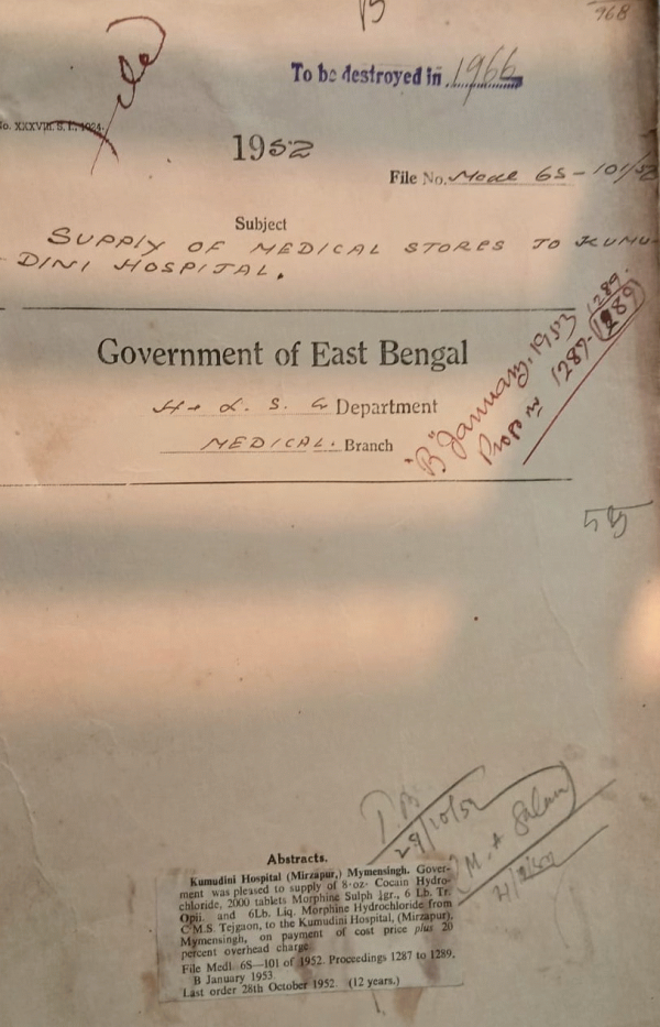 | Rack No. 10, Bundle No. 120 Sl No. 9952 Recruitment to a temporary post of professor of Ear, Nose, and throat diseases in the Dacca Medical College. | Rack No. 10, Bundle No. 120 Sl No. 9953 Plan of estimates for Raising the compound of compounder's quarters at Habigonj, Sylhet. | Rack No. 10, Bundle No. 120 Sl No. 9954 Arrear land rent of Ramoo Thana Dispensary Chittagong. | Rack No. 10, Bundle No. 120 Sl No. 9955 Supply of medical stores to Kumudini Hospital. | Rack No. 10, Bundle No. 120 Sl No. 9956 Improvement to Sub-Divisional Hospital at B. Baria in the District of Tippera. | Rack No. 10, Bundle No. 120 Sl No. 9957 Drugs Act. 1940 Exemption from Rules requiring dealers in drugs to take on licenses and engage qualified dispensers. | Rack No. 10, Bundle No. 120 Sl No. 9958 House building advance to govt. Servants at hobiganj district in East Bengal. |