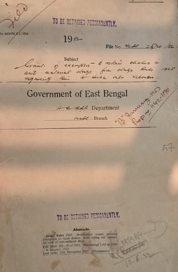 | Rack No. 10, Bundle No. 120 Sl No. 9954 Arrear land rent of Ramoo Thana Dispensary Chittagong. | Rack No. 10, Bundle No. 120 Sl No. 9955 Supply of medical stores to Kumudini Hospital. | Rack No. 10, Bundle No. 120 Sl No. 9956 Improvement to Sub-Divisional Hospital at B. Baria in the District of Tippera. | Rack No. 10, Bundle No. 120 Sl No. 9957 Drugs Act. 1940 Exemption from Rules requiring dealers in drugs to take on licenses and engage qualified dispensers. | Rack No. 10, Bundle No. 120 Sl No. 9958 House building advance to govt. Servants at hobiganj district in East Bengal. | Rack No. 10, Bundle No. 120 Sl No. 9959 Special pay to Maulvi Sultam Ahmed Ward Master Mitford Hospital, Dacca. | Rack No. 10, Bundle No. 120 Sl No. 9960 Creation of 2 posts of Darwan and 2 posts of mails for the Sadar Hospital Barisal. |